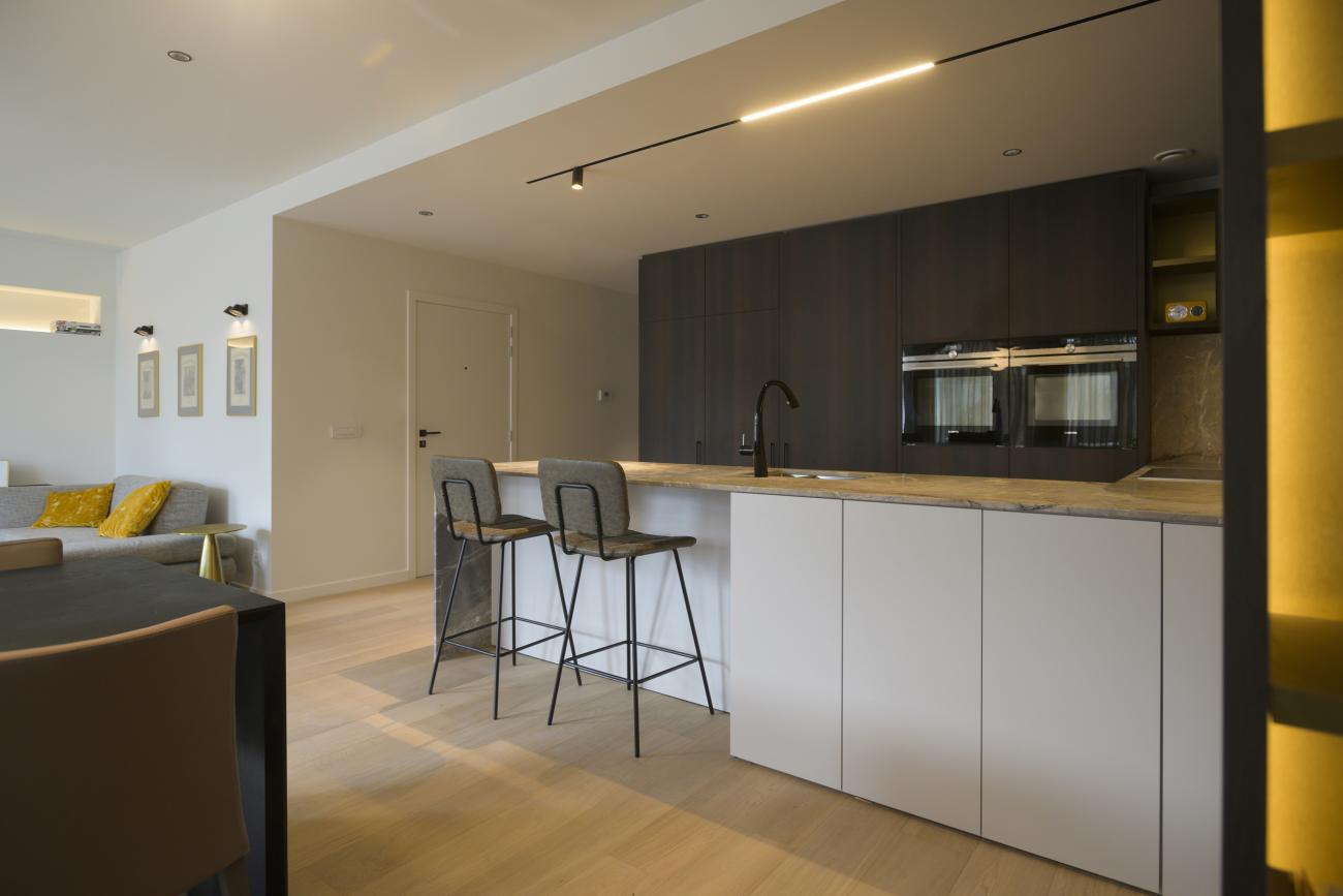 Door een ingrijpende renovatie werd dit appartement niet alleen in zijn grandeur hersteld, maar werd deze ook voorzien van de allerlaatste technieken. Zo werden de rondbogen mooi uitgewerkt en geïsoleerd, werden de stalen ramen vervangen door goed isolerende aluminium ramen en beschikt het volledige appartement nu over vloerverwarming. De gebruikte materiaalkeuze zoals de natuursteen, de goud-accenten & het veelvuldig gebruik van donker, warm hout zorgen voor een luxueuze aankleding. Door dezelfde materialen telkens te laten terugkeren oogt het interieur toch erg rustig.